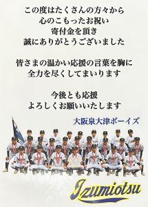 「大阪泉大津ボーイズ」さんへご寄付お渡ししました。
