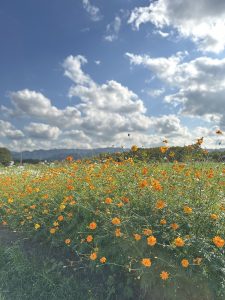 コスモスも少し咲いてはいましたが、今年は猛暑が続いたため植え付けをあえてタイミングをずらしたそうで、まだ満開ではありませんでした。